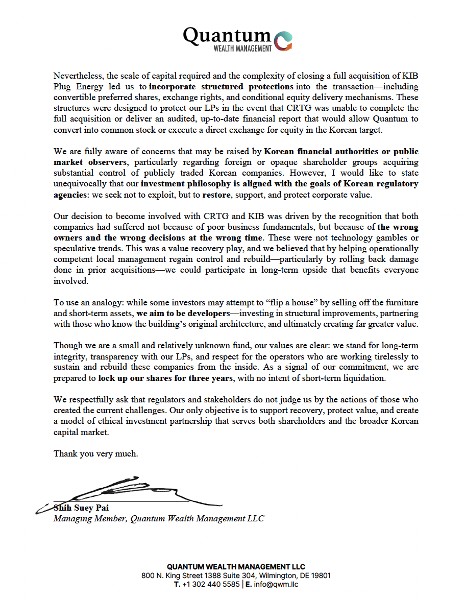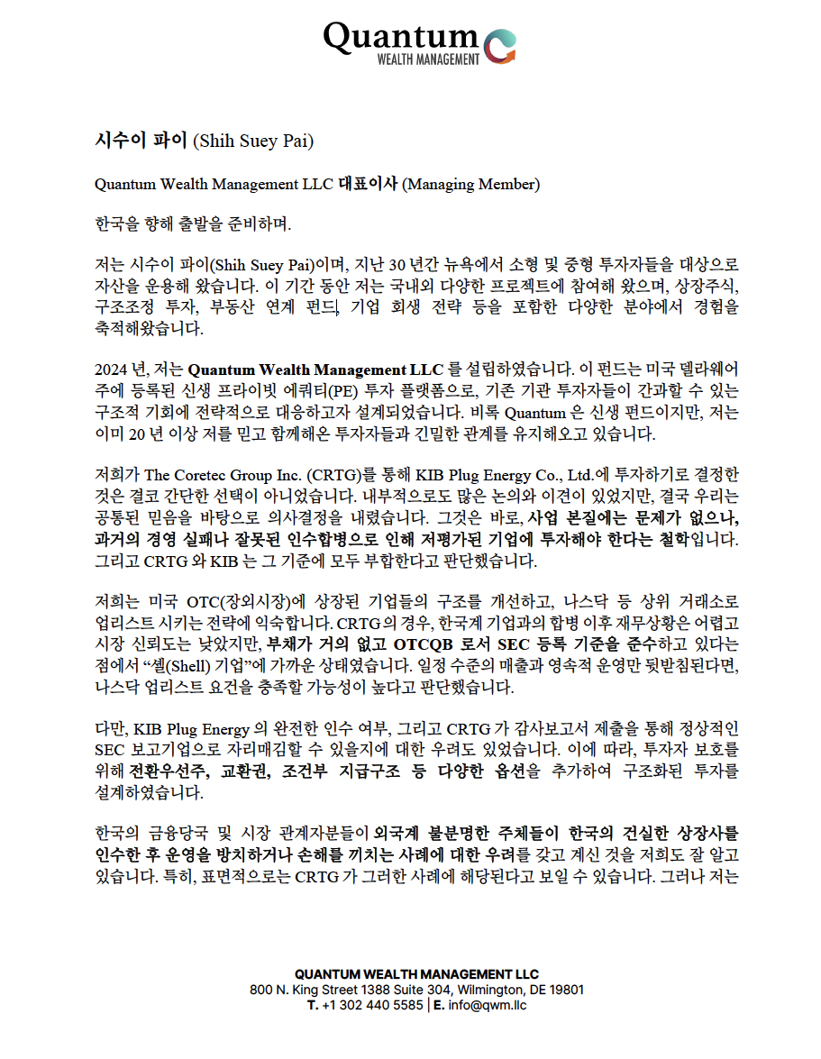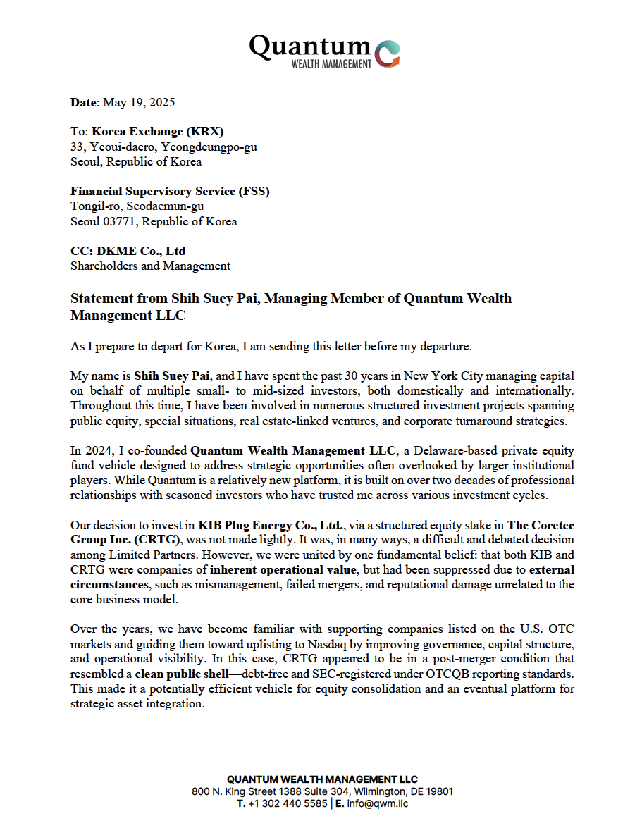 Quantum Wealth Management LLC(이하 “Quantum”)는 당초 The Coretec Group Inc.에 대한 우선주 투자를 통하여, 당시 대한민국 KIB Plug Energy Co., Ltd(현 DKME Co., Ltd.)의 대주주로서 경영 정상화 및 기업가치 제고를 추진하는 구조를 기획하였습니다.