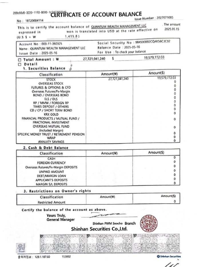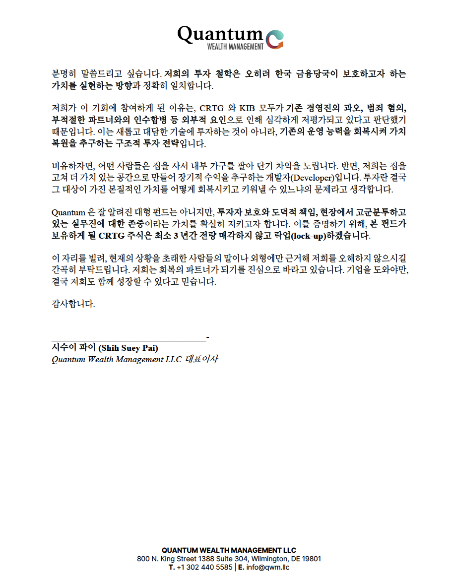 그럼에도 불구하고 Quantum은 한국거래소 및 시장의 우려와 의구심에 대하여 정면으로 대응하기보다는, 거래재개라는 공동의 목표를 우선시하며 순수한 투자 의지와 책임 있는 주주로서의 입장을 지속적으로 표명하여 왔습니다. 또한 관련 자료를 성실히 제출하고 감독기관과의 협력을 통해 객관적 사실에 기반한 판단이 이루어질 수 있도록 노력해 왔습니다.