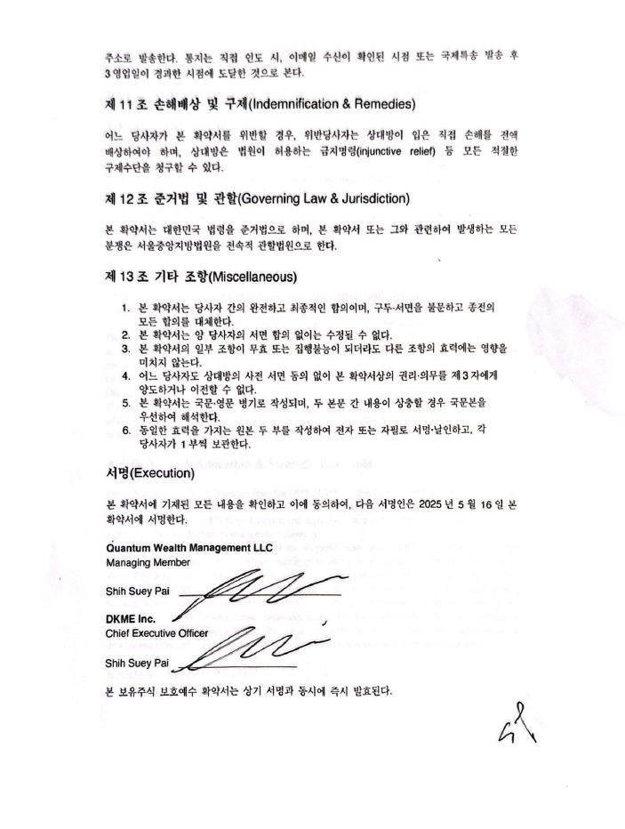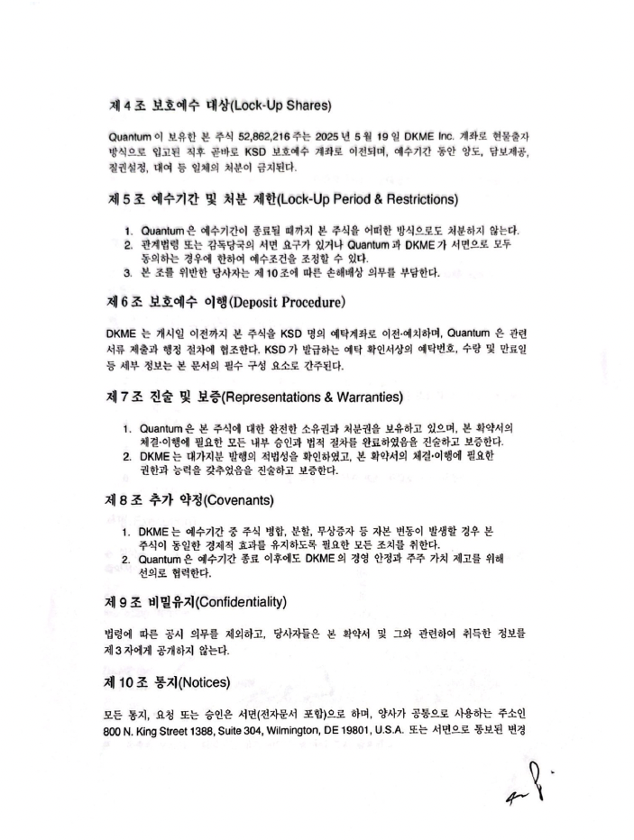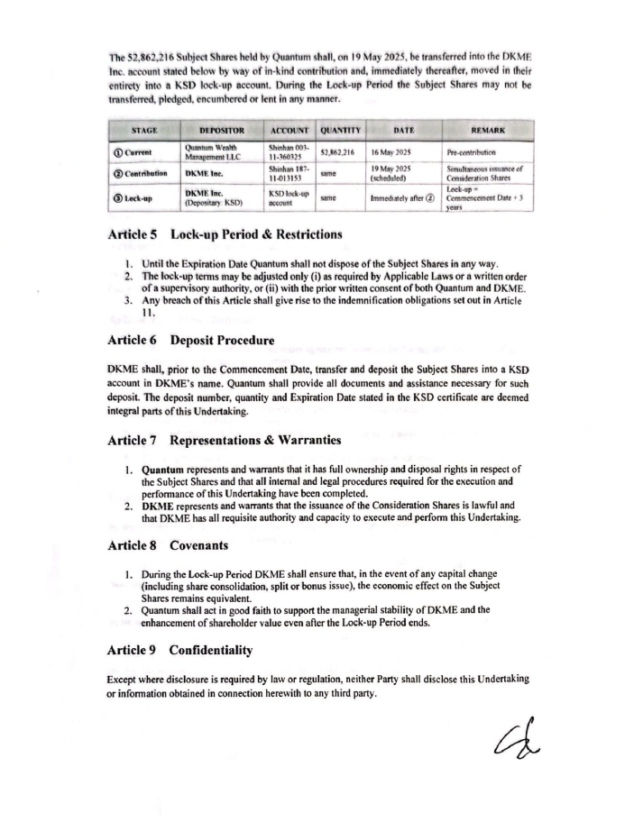 DKME Inc. 사로의 현물출자 이후 3년간 자발적인 락업