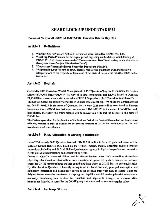 구체적으로, 당초 The Coretec Group Inc.에 우선주 형태로 투자되었던 투자금 및 The Coretec Group Inc.가 투자하여 확보하였던 DKME 주식회사의 대주주 지분을 교환하는 구조를 설계하였으며, 이를 현물출자 방식으로 전환하여 미국 델라웨어주에 지주회사인 DKME Inc.를 설립하였습니다. 이후 당사는 보유한 DKME Inc. 지분 100%를 현물출자하고, 그 결과 보유하게 된 DKME 주식회사 지분 전량에 대하여 3년간의 자발적 보호예수(Lock-up)를 설정하였습니다.