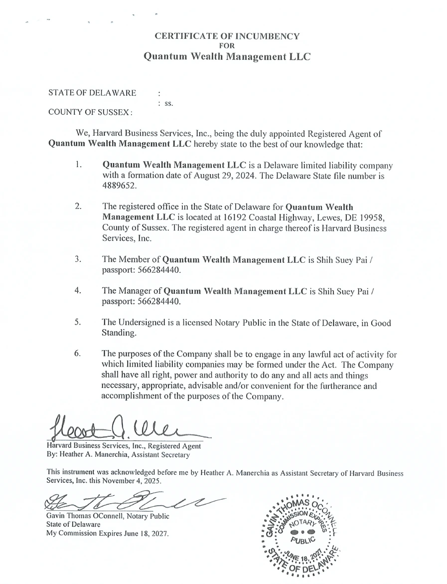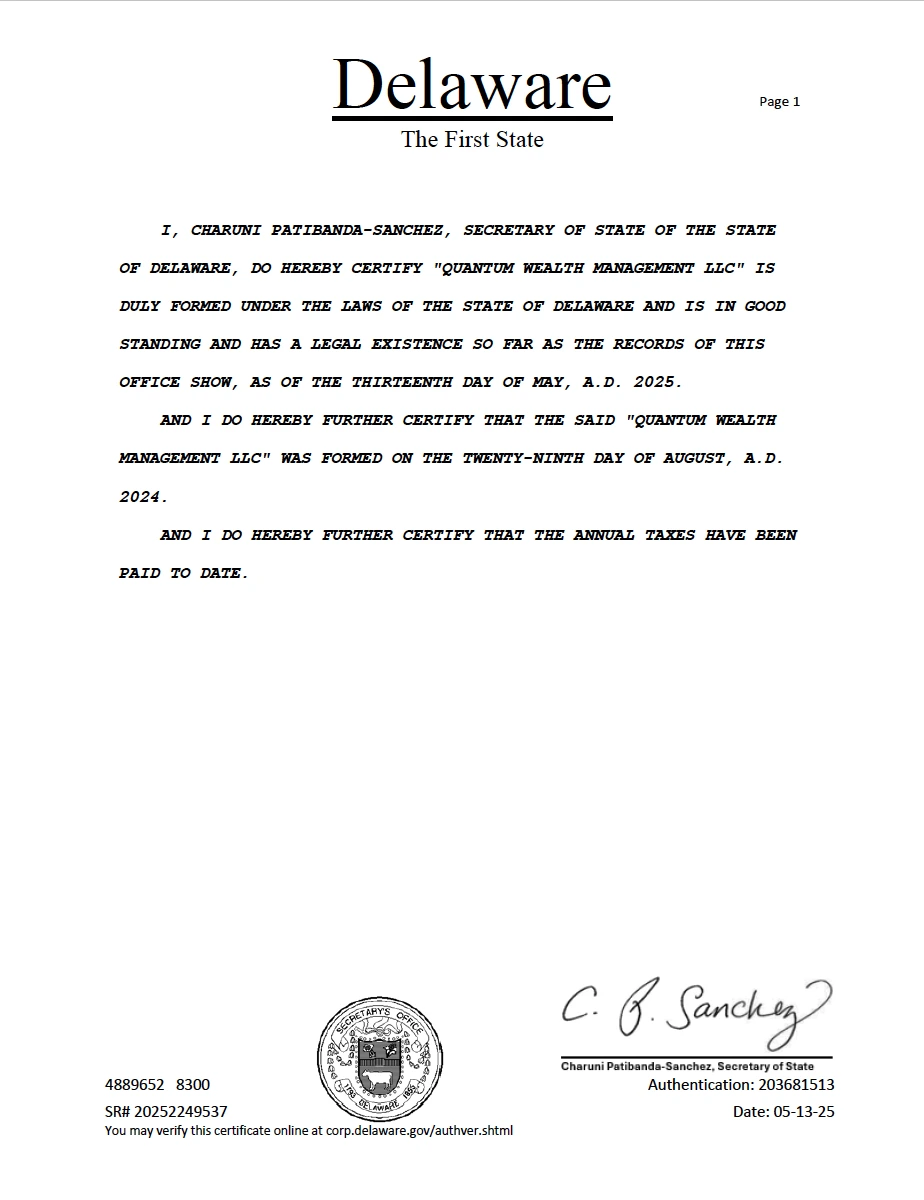Quantum Wealth Management LLC는 미국 델라웨어주 법률에 따라 적법하게 설립된 유한책임회사로서, 2024년 8월 29일 설립되었습니다. 델라웨어주 국무장관(Charuni Patibanda-Sanchez)의 인증에 따라 현재 Good Standing 상태를 유지하고 있으며, 모든 연례 세금 납부 의무를 이행하고 있는 법적으로 유효한 법인입니다.