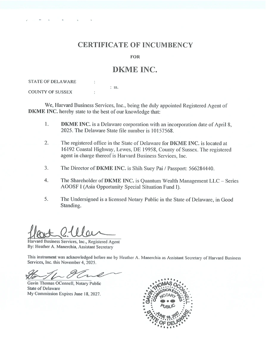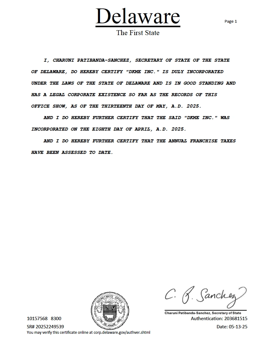 DKME Inc.는 2025년 4월 8일 미국 델라웨어 일반회사법(Delaware General Corporation Law)에 따라 설립된 법인으로, 단순 운영회사가 아닌 전략적 자산 보유 및 구조화 투자 플랫폼으로 설계되었습니다.