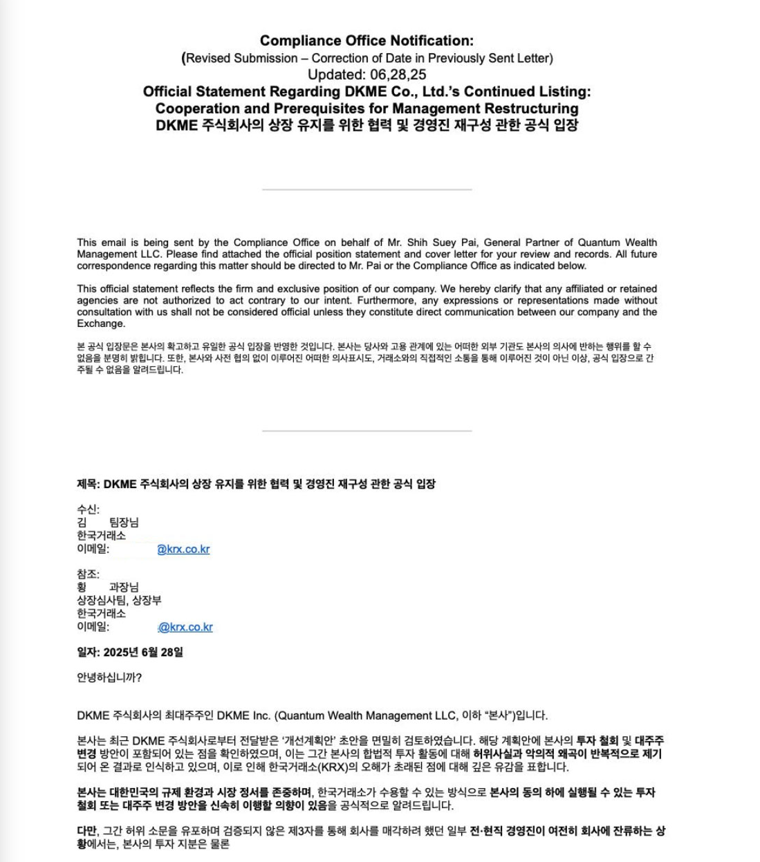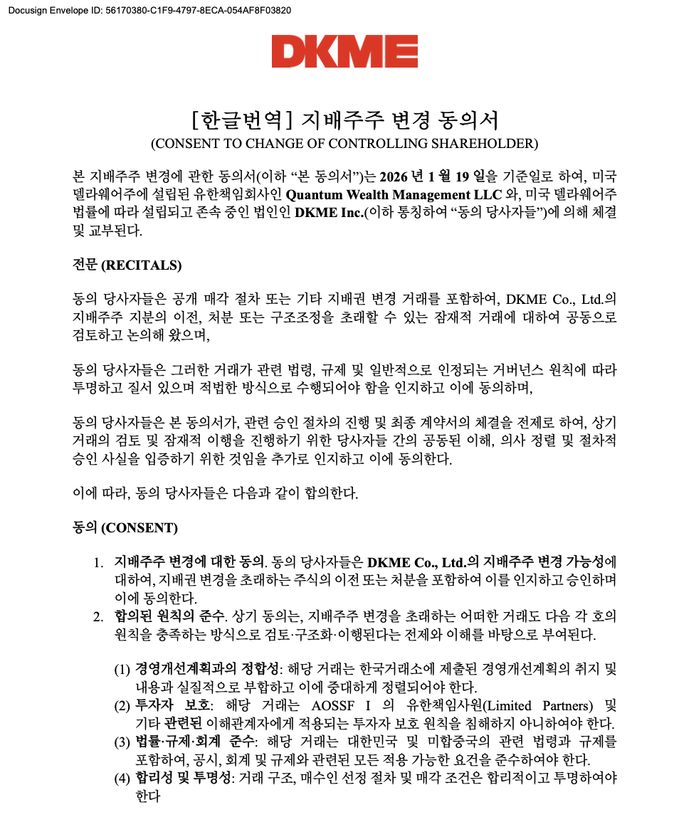 그간 시장에서는 자회사인 DKME 주식회사의 일부 경영진이 대주주를 배제한 채 특정 이해관계자와 매각을 논의하려 한다는 추측, 또는 일부 주주가 개인적 이해를 위해 매각 과정에 영향을 미치려 한다는 의혹이 제기된 바 있습니다. 이러한 내용은 공식적으로 확인된 사실은 아니나, 매각 절차의 투명성과 공정성에 대한 우려를 낳기에 충분한 정황들이 외부에 노출되었던 것도 사실입니다.